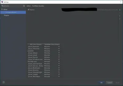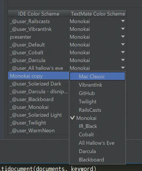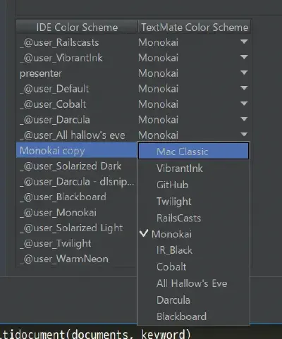 このとき TextMate と PhpStorm とで、カラースキーマを合わせる設定をします。IDE Color Schema に合わせて TextMate Color Schema を設定していきます。私の場合は Monokai copy という名前で Monokai をちょっと弄ったものを使っているので、これに合わせて Monokai を選びます。(すべて Monokai になっていますが使っているテーマに合わせて、だけでよいです。)