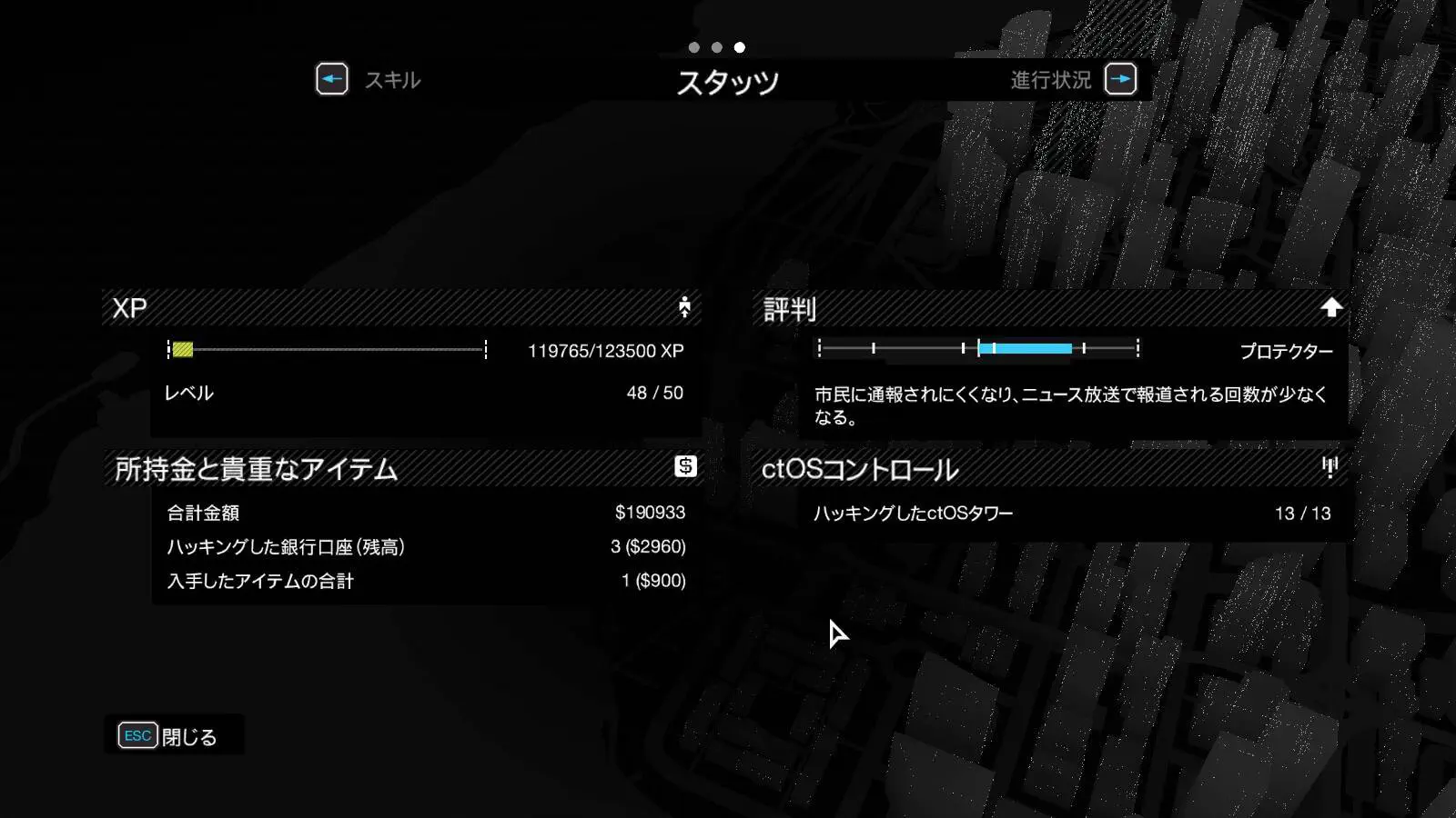 ストーリー面については公式サイトなどをちゃんと見てないのもあってか、バックグラウンドとか、なんでそんなハッキングするようになったのかとか、世界観的なものはちょっとわかりにくかったです。途中から収集品を集め始めたので ctOS や DedSec らへんの話が補完されて、なるほど〜〜という気持ちでした。 いくつかエンドのパターンがあるとロールプレイの楽しさも生まれてよりよいのかなーと思います。 全体ボリュームは結構満足な量でした。どちらかというと、メインストーリーを補完するような、ストーリー性のあるサイドストーリーがほしかったかなあ。フィクサー契約もギャング〜も悪いやつがいるから懲らしめよう!的なノリで、ストーリーに影響なかったなあーと。