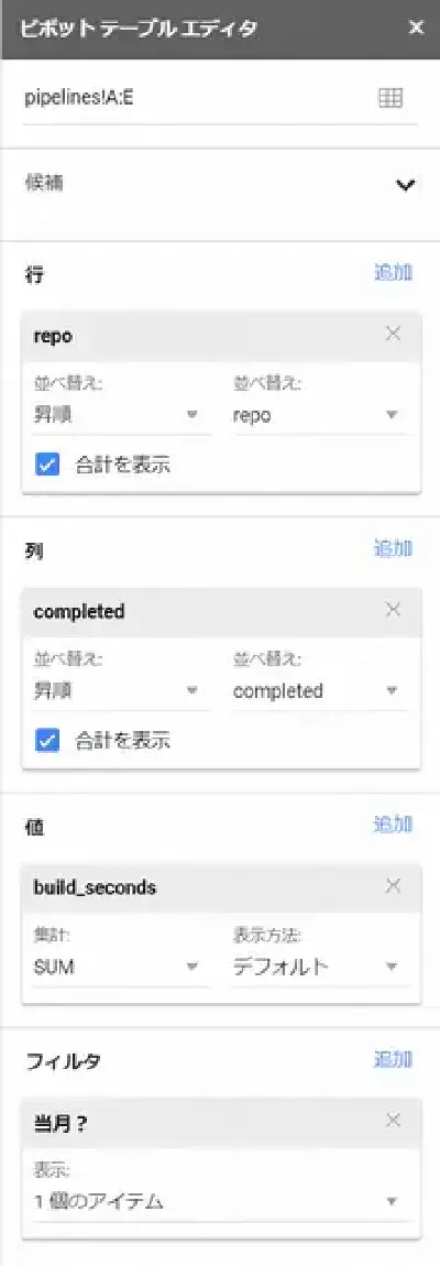 ピボットテーブルを使って、当月の、各リポジトリの、実行時間(秒)を合計します。
