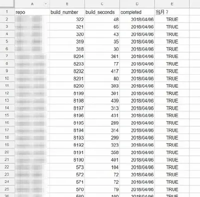 実行するとこんな感じに Pipelines のデータが収集できるので、ここからスプレッドシートの機能で集計していきます。