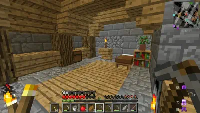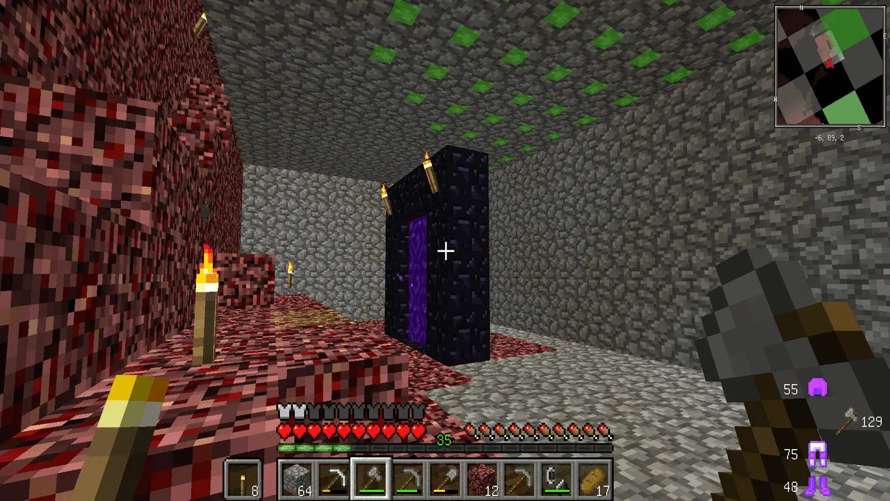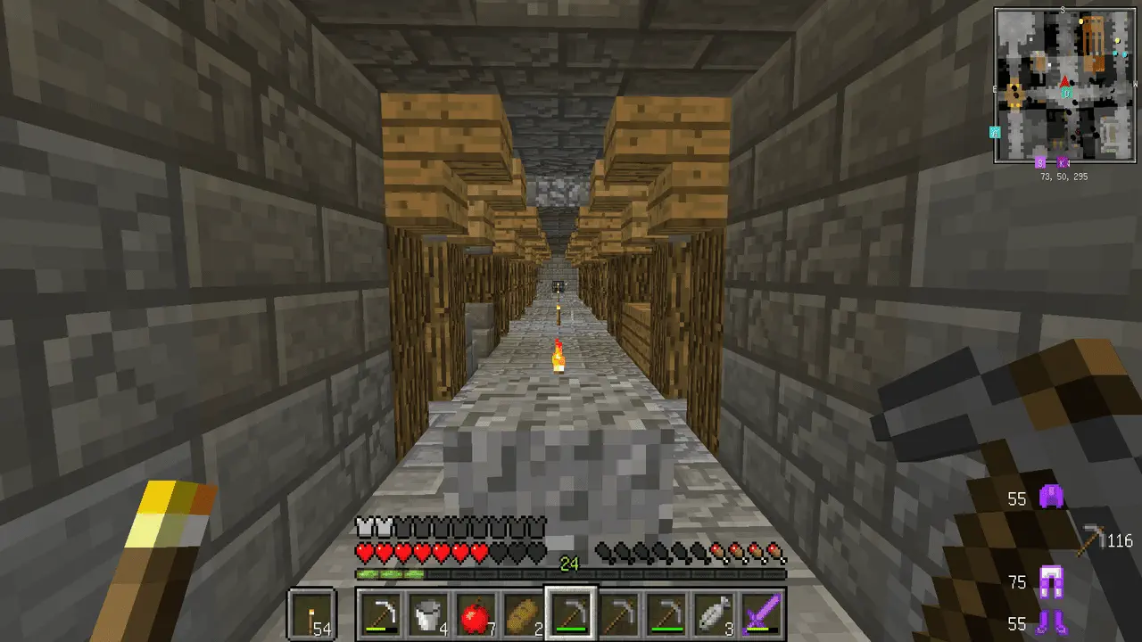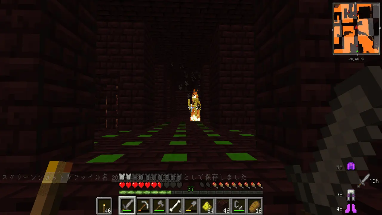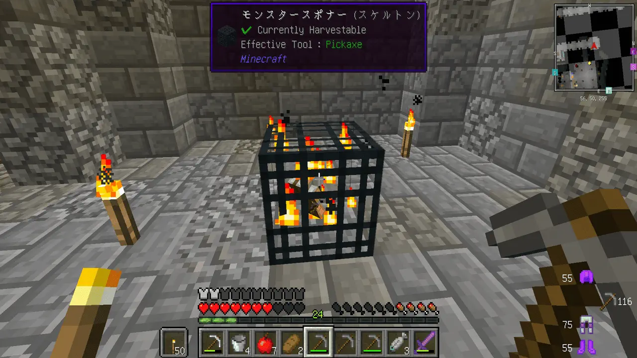 螺旋階段があるところで下の階層に降りていけます。 階層を降りるにつれて、よりスポナーの数が増えていて、かつ他 mod の影響下もしれませんが、エンチャントされた装備品もつけていました。