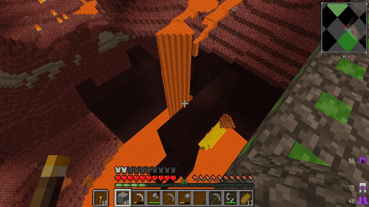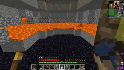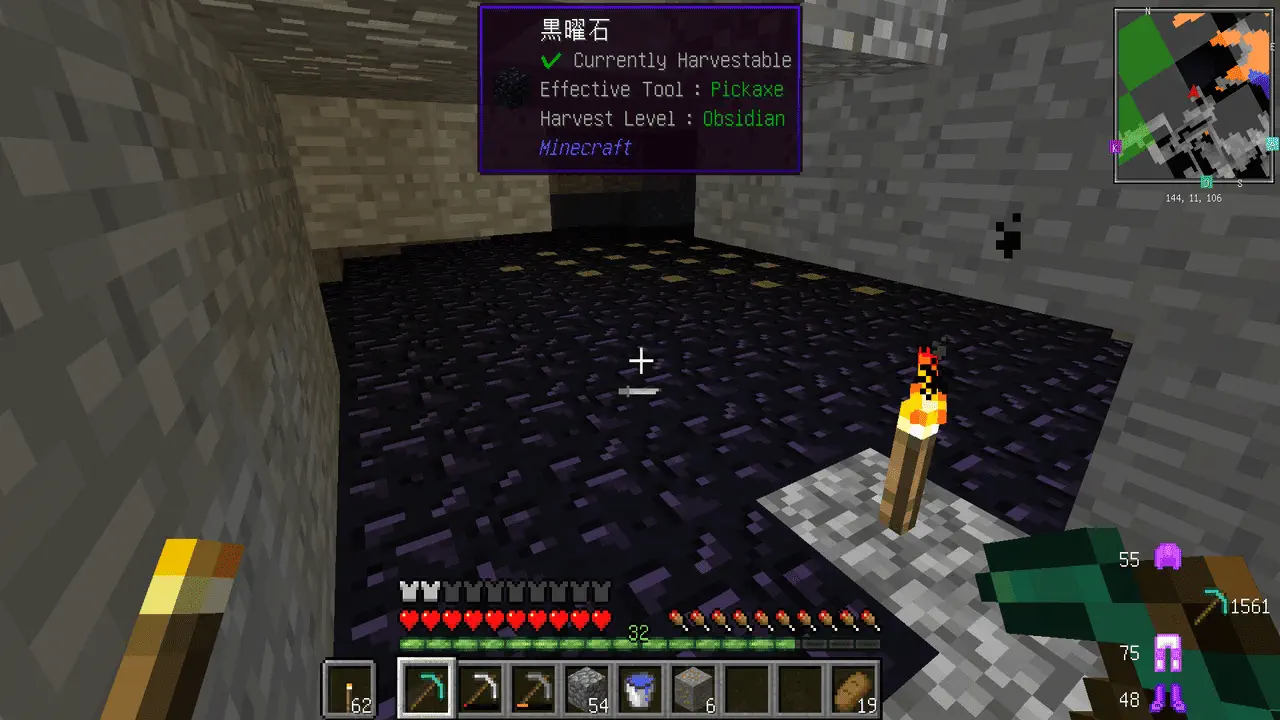 水をバケツにいれて、溶岩だまりにどばーっとぶっかけて Vein Miner の一括採掘機能をガシガシ掘ります。 すぐに掘り切れるので超便利。もちろん掘ったブロック数だけ耐久度も減ってます。
