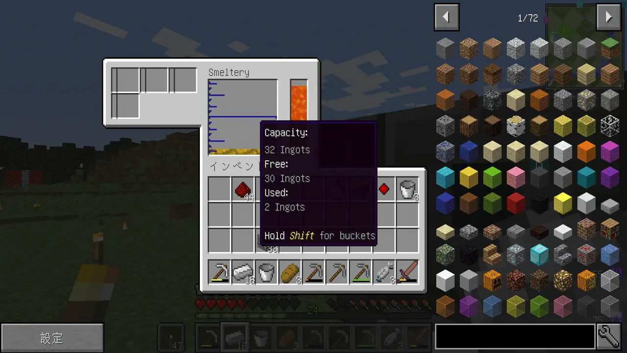 まずは製錬炉を作ります。 Smelter を組み立て、コントローラーを使えるようにします。タンクも壁としてカウントされ、バケツで溶岩を入れることを忘れずに。中が 2x2 くらいあれば 1 段でもおけです。小さすぎると一度に溶かせる量が減って面倒です。 型を置く台 Casting Table を用意します。このときに下にホッパーおいたら、冷え固まったものが勝手にチェストへ流れるので便利。