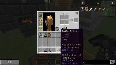 今回はとりあえず黒曜石を掘ることができればよいので、ツルハシの頭だけ黒曜石、あとは適当に木や石で作ります。