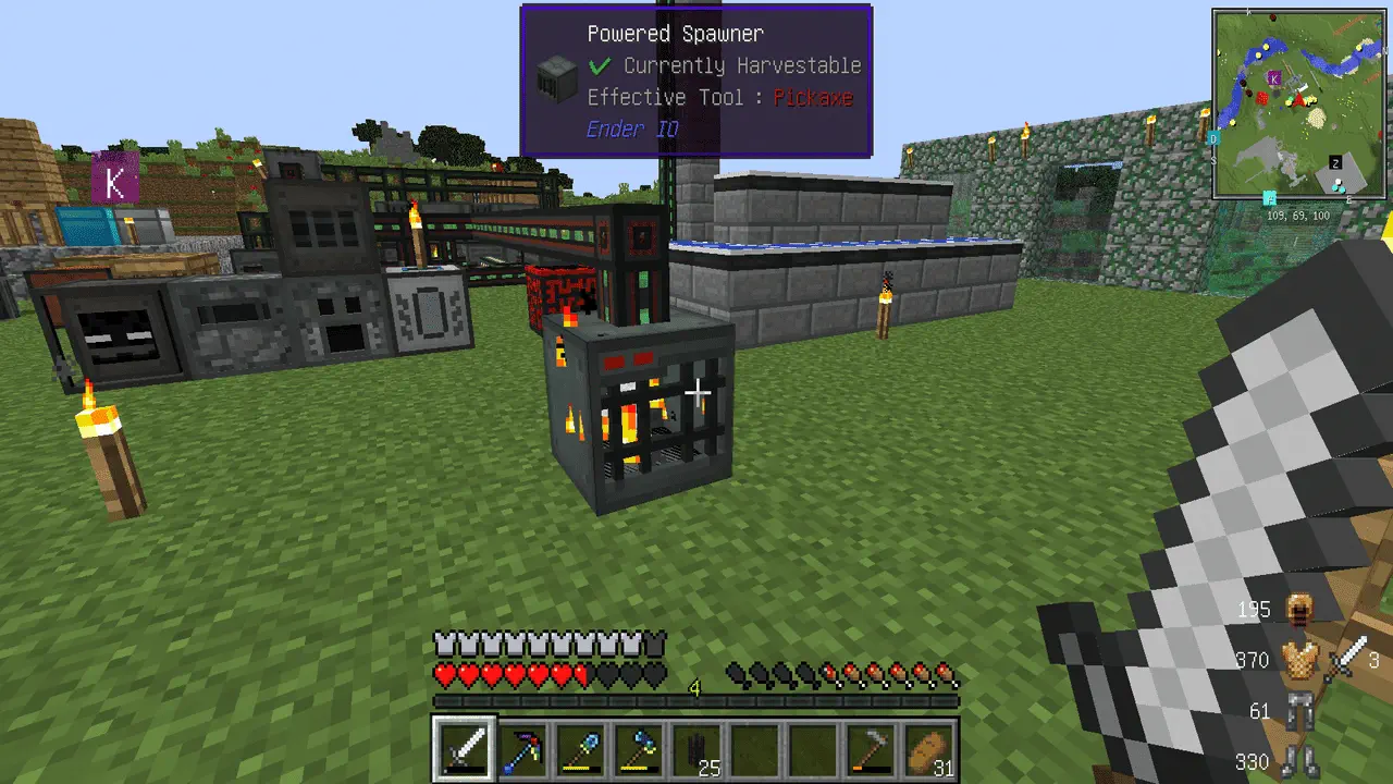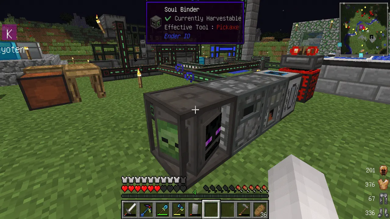 EnderIOの環境では、通常のスポナーを壊すと、壊れたスポナーとしてドロップします。 そこへ、モブの魂を入れるビンを作って、Soul Binderを使って好きなモブのスポナーにすることができます。