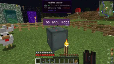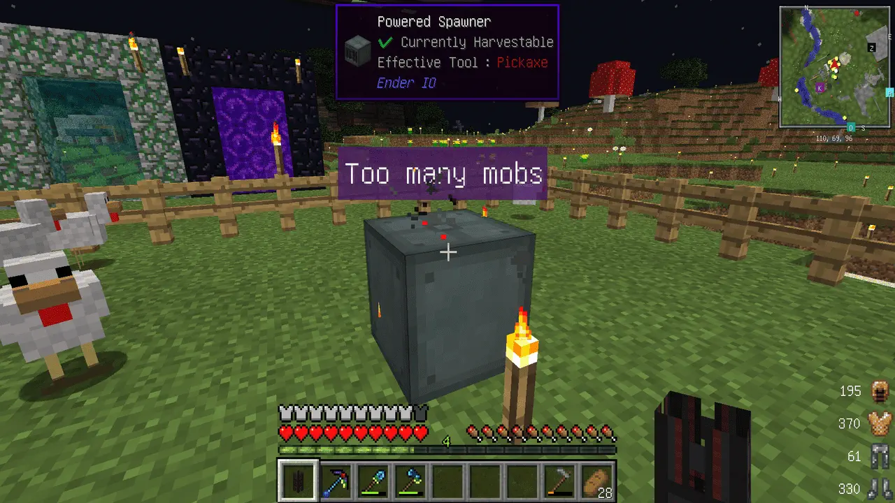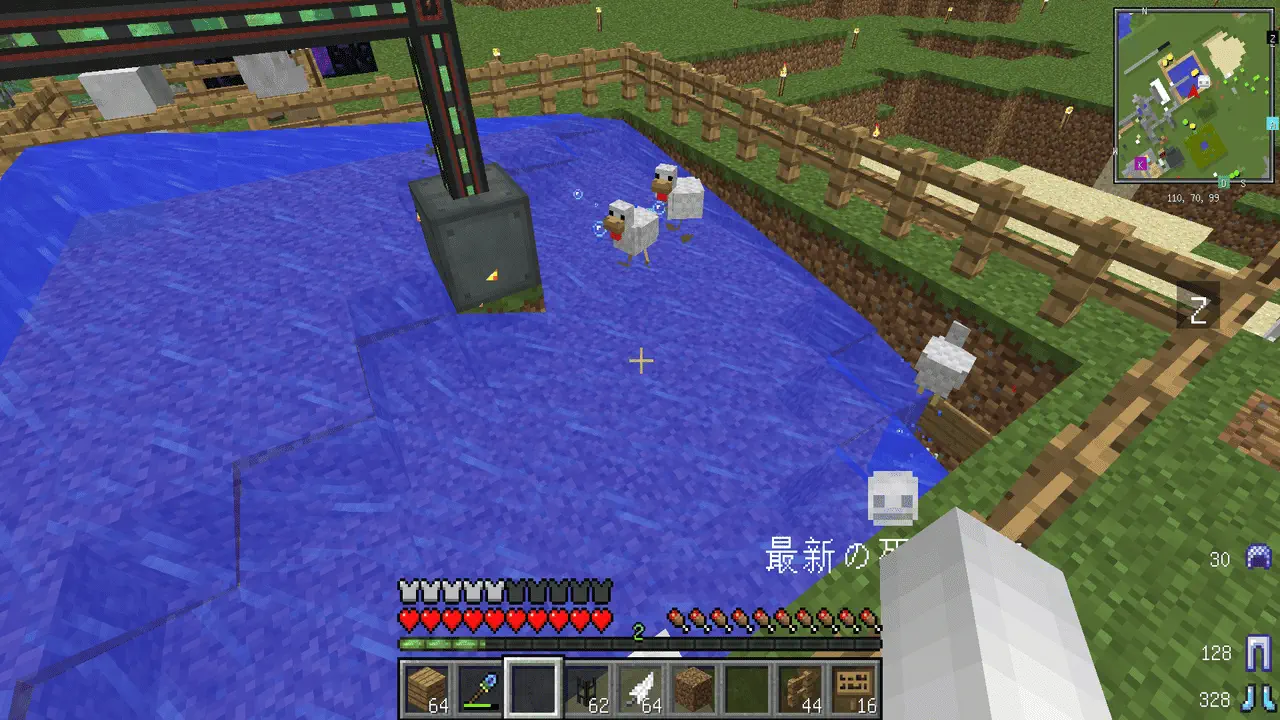 ので、貯めるのをあきらめて、水流で流し、ExtraUtilitiesのスパイクで倒すことにします。 鳥肉の備蓄が十分になれば、遠距離攻撃のない歩行系のモブ、ウィザースケルトンなどに入れ替える予定です。