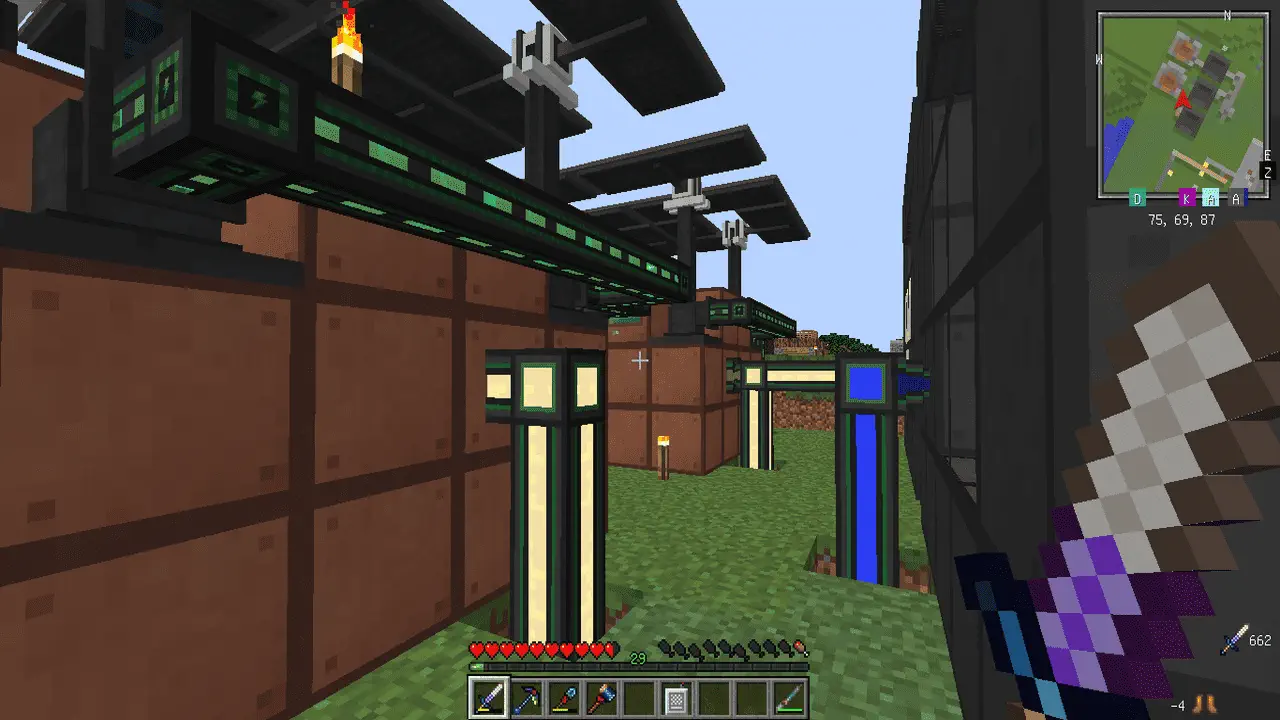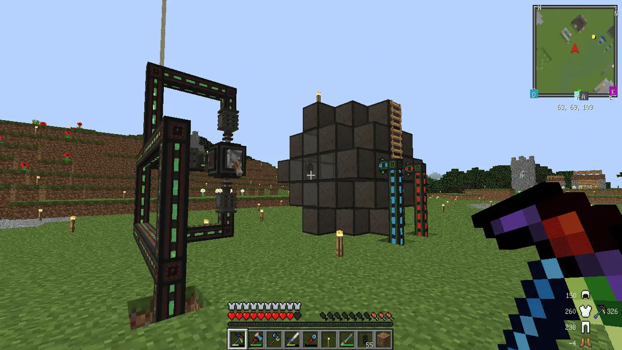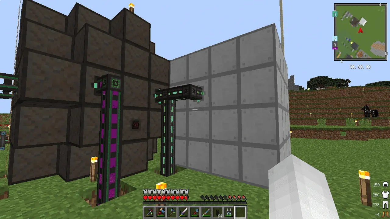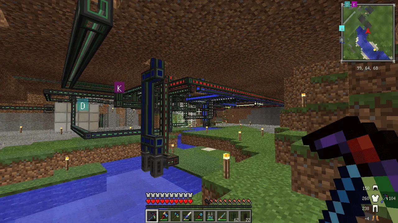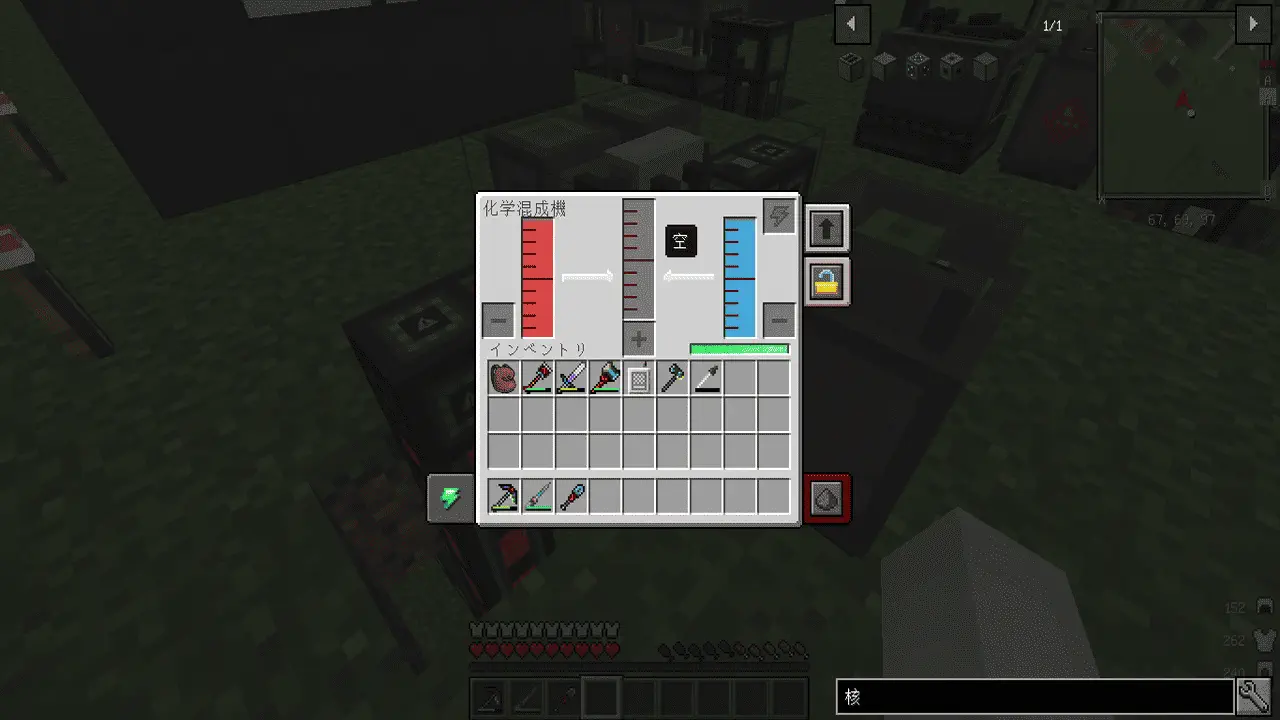 あとあと分かったのですが EnderIO のケーブルを使うと 1 マスにエネルギーとアイテムと液体を一緒にできるのでスペースがスッキリします。さらに Mekanism のケーブルと異なり、中身が見えないので動作も軽量なようです。容量的には Mekanism よりも少し劣りますが、それで困るときは直列で配置しすぎているはずで、それ以上の拡張も見込めないので、早々に並列な配列にしていく必要があるはずです。
