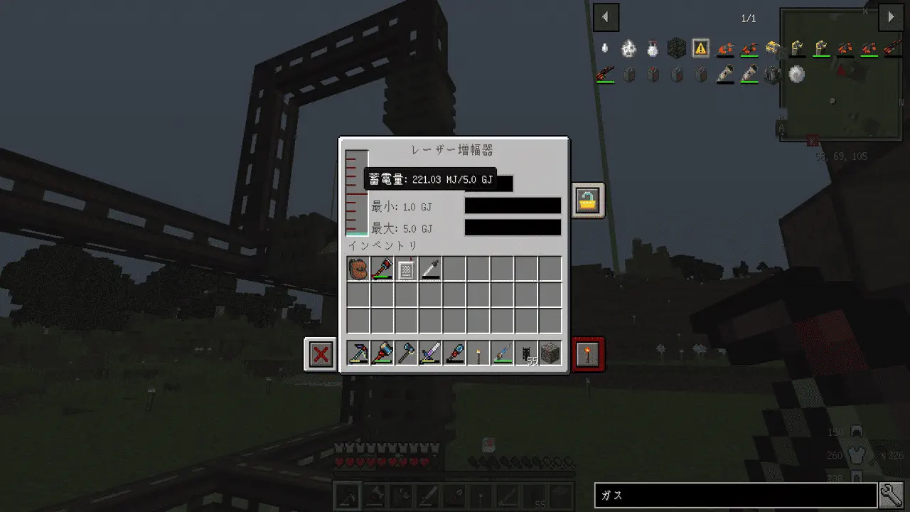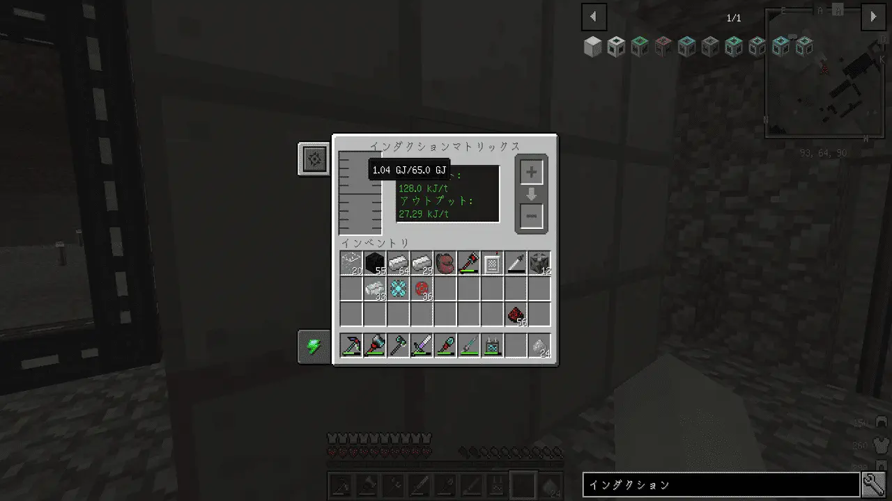 するとものすごい勢いで電気が流れてくるので、無駄にならないよう真っ先に各種機械とケーブルをアップグレードしつつ、もう一つインダクションマトリクスを作りました。こっちは再点火時のレーザー用の電力を確保しておくものです。