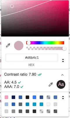 ところで、いま Chrome の DevTools を見ると、文字色のカラーピッカーにコントラストレートという情報が増えていることに気づきました。