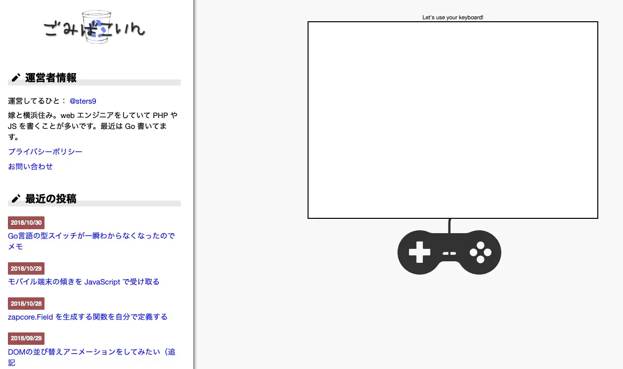 トップページも自作テーマにのせたので、トップページでもブログコンテンツが出るようになった。 コントローラーも追加して、ちょっと遊べるようにした。 モバイルだと傾きによって重力の向きが変わるようになっていて、コロコロカービィみたいな遊びもできた。