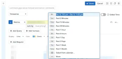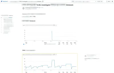この画像はレイテンシに関するアラートが出たときに、いろいろ見ていたらある処理のタイムアウトのメトリクスが関係あるのでは?と一緒に並べてみたときのもの。