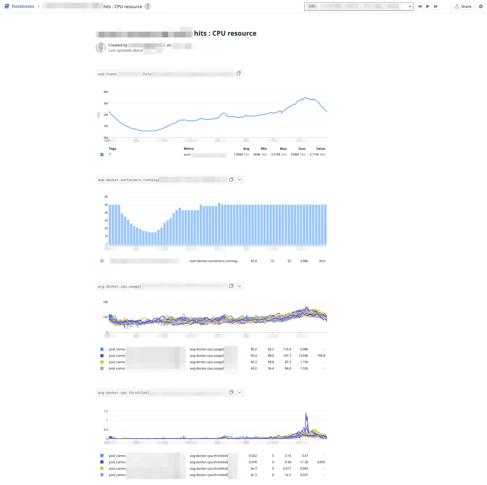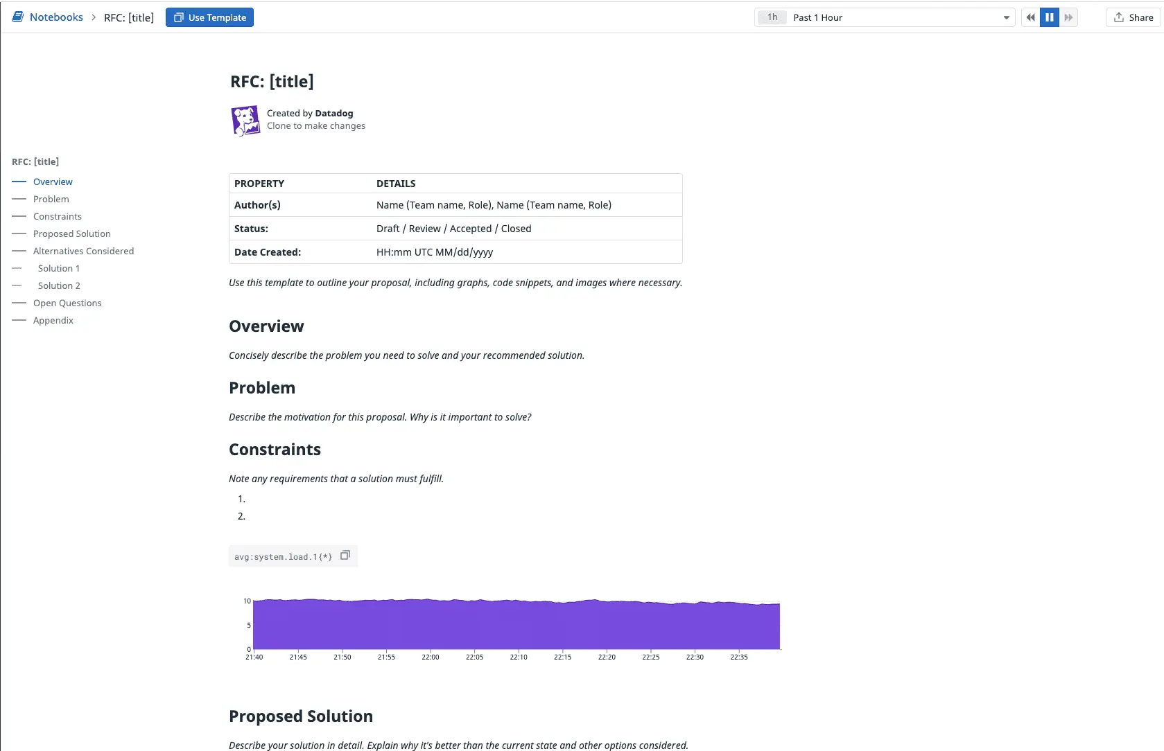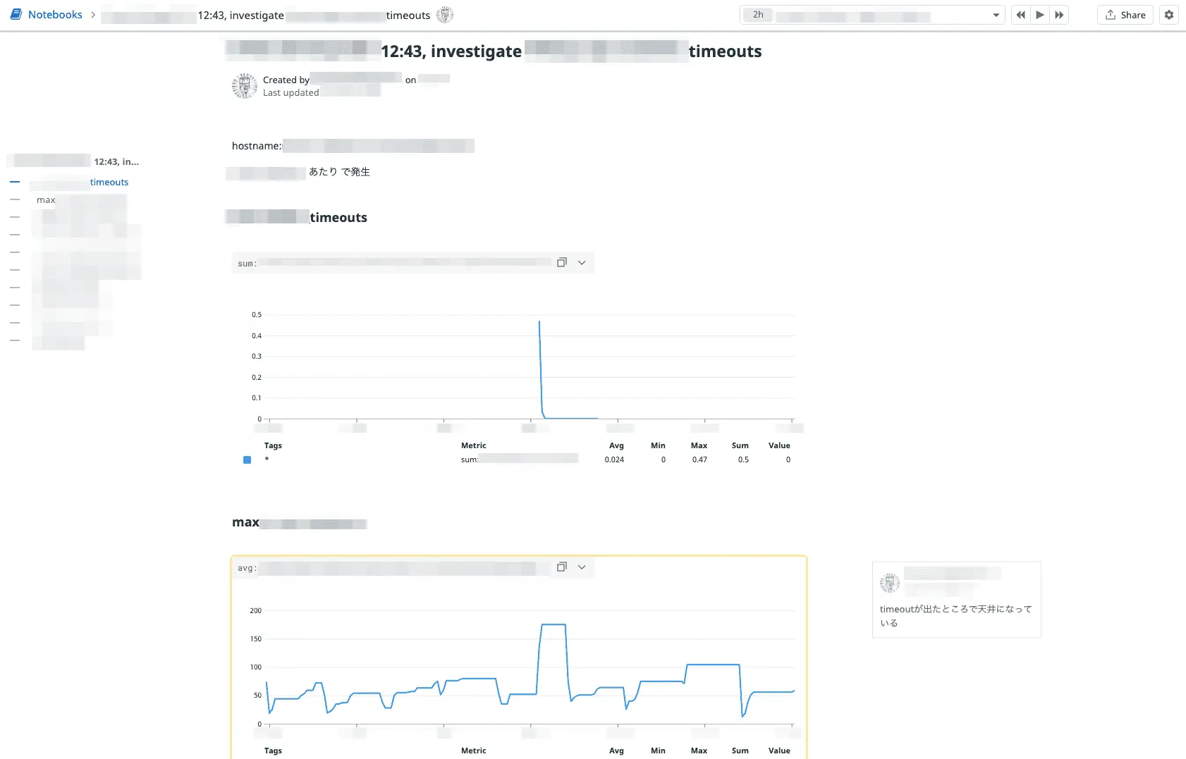 Datadogには ノートブック という機能がある。 これは何かというと、いわゆるJupyter Notebook のDatadog版で、テキストを書いたり、特定の時間帯のメトリクス、トレース、ログなどDatadog上のなにがしを載せたりできる。ライブコラボレーションもできる上に、横にコメントもつけられる。