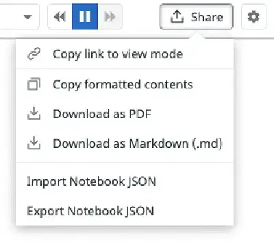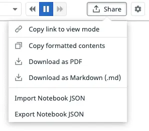 Shareボタンの中に Copy formatted Contents という機能もあって、Notebookの内容をまるっとフォーマットされた状態のままコピーしてくれるものもある。これはHTMLをコピーした状態になるので、HTMLフォーマットに対応しているエディタ、GoogleDocとか、に貼り付けるとそのままの見た目で張り付けてくれる。同じ見た目でPDFもMarkdownも出力できる。Markdownはテキストだけかと思いきや、base64エンコードされたグラフの画像もついてくる(!!)