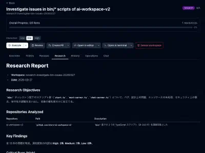 「調査したい」とかをinitするときにつけるとresearchモードになって、Researchタブが生えてくる。executeするといろいろ調べて、最終的に結果をまとめてくれる。もちろん複数リポジトリも対応。