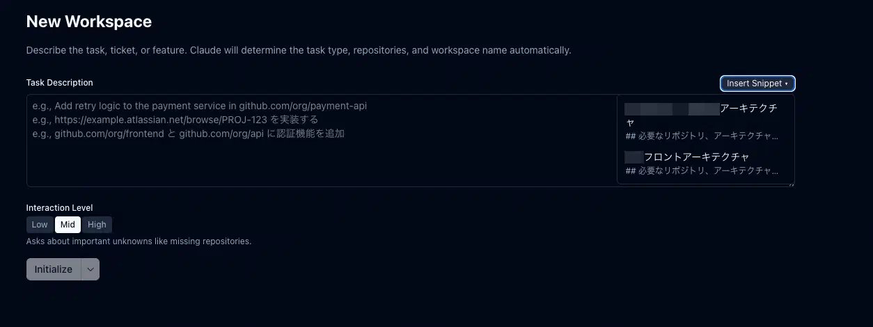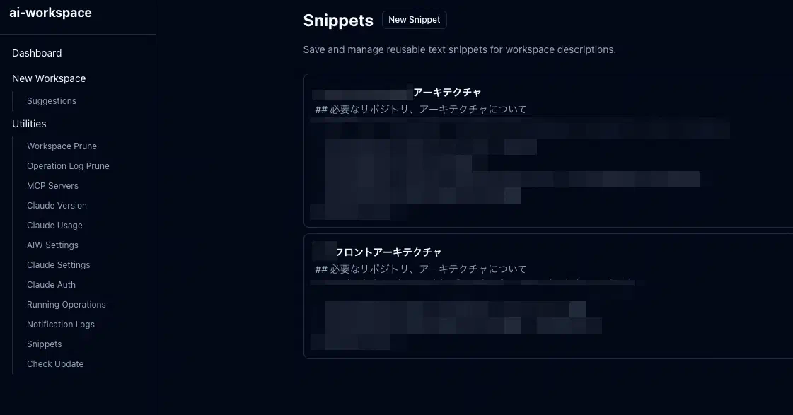 主にNew workspaceするときに、毎回アーキテクチャや必要なリポジトリを説明しているけれど書かなくていいよねということでスニペット枠を用意した。